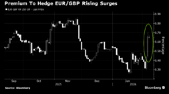 就像11月预算案时的价钱走势相同,期权交往员更倾向于把欧元行为同一应答英国私有风险的最好器用。上周,对冲英镑兑欧元在将来一个月下降风险比拟对冲上升风险的溢价升至11月下旬以来的最高水平,也创7月以来的最大涨幅。