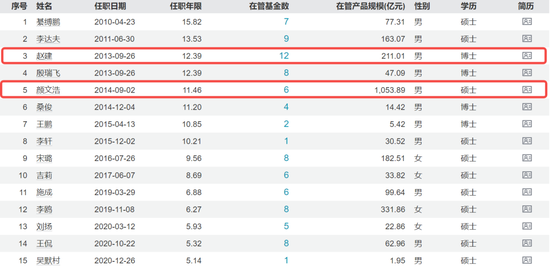 同期,赵建(任职时长为12.39年)料理基金数目为12个,比较东谈主均料理基金数的行业平均水平偏高,但从侧面响应其或面对单一基金限度较小的狼狈处境。