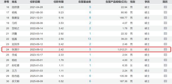此外,两名基金司理的料理产物限度卓绝千亿,差别是颜文浩(料理限度1053.89亿元)和张清宁(料理限度1012.21亿元)。