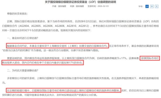 第一项公告讦生在2月2日晚间,国投瑞银发布公告称,因海外银价暴跌,公司将旗下LOF基金的估值步地,从“上海期货往还所结算价”改为“参考海外银价波动”,因此导致该基金单日净值暴跌了31.5%。